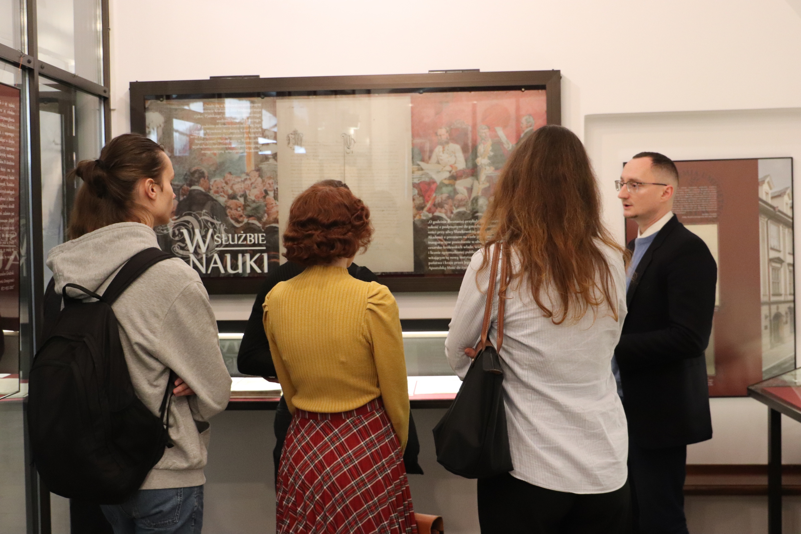 Po pokazie dyrektor Archiwum, prof. Tomasz Pudłocki, oprowadził naszych gości po wystawie, prezentującej dzieje Polskiej Akademii Umiejętności. Ekspozycja powstała i eksponowana jest z okazji 150-lecia powołania tej instytucji.
